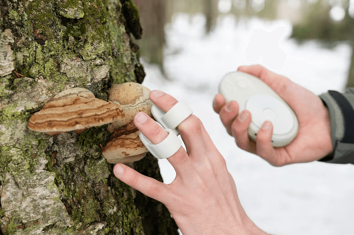 Sensors worn on your fingers captures data such as pH, bioelectrical signals, and moisture levels from the elements of nature you grace with your hand. This data is transmitted to the Collector in real time.